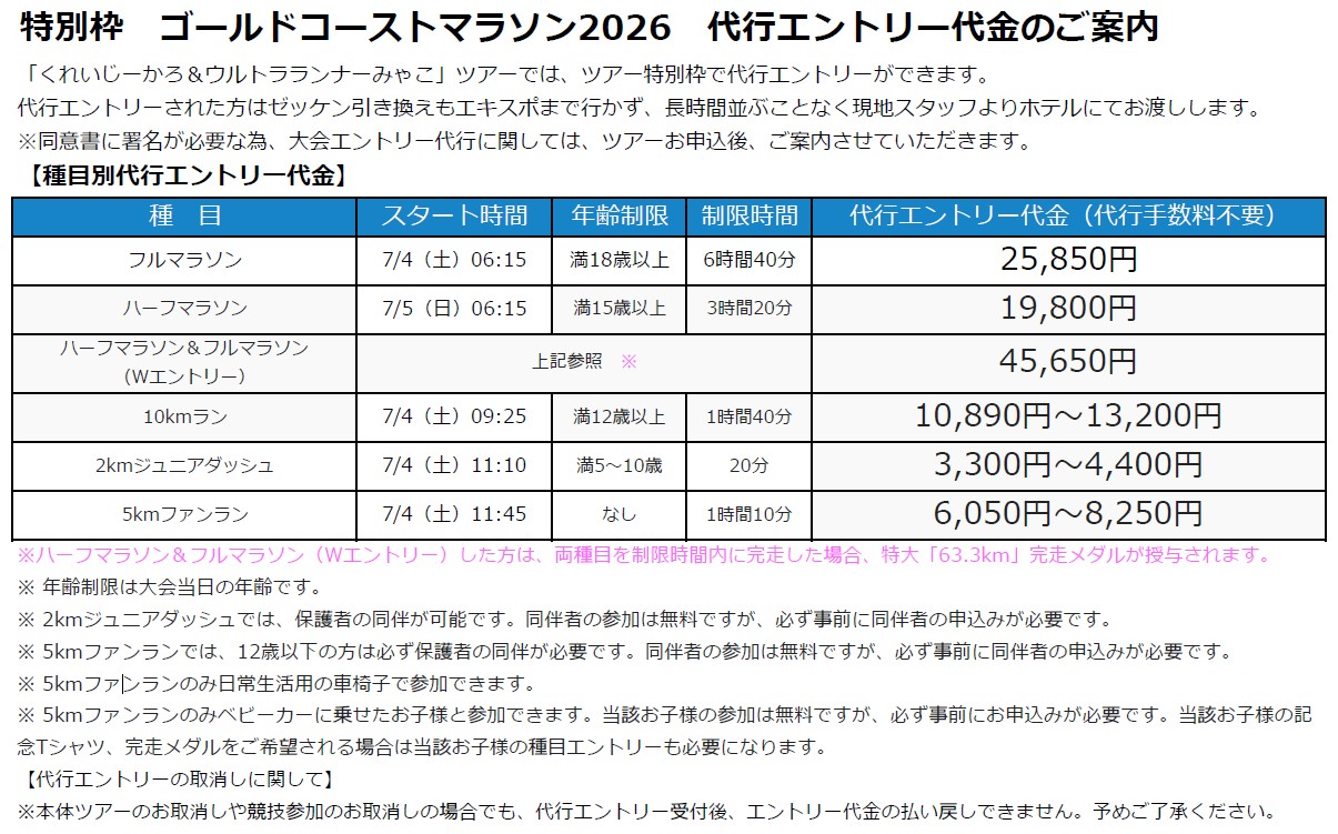 「くれいじーかろ&みゃこ」ツアーでは、特別枠で代行エントリーを行います。ツアーお申込後、ご案内いたします。