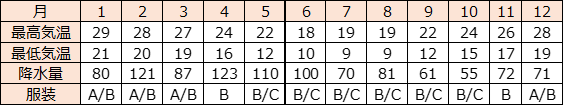 ※ 気温は℃、降水量はmm ※ A:夏服・半袖 B:薄手のセーター、カーディガン等
